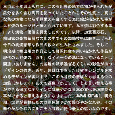 JAPAN KUTANI、明治期、世界が賞賛したのは原色鮮やかで煌びやかな九谷、その華やかな色絵の文化こそ九谷焼が持つ最大の魅力だと思います。