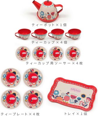 ) 材質:ブリキ セット内容: ティーポット×1個/ティーカップ×4個/ティーカップ用ソーサー×4枚/ティープレート×4枚/トレイ×1個 対象年齢: 3歳以上楽しくおしゃべりしながらティータイム♪